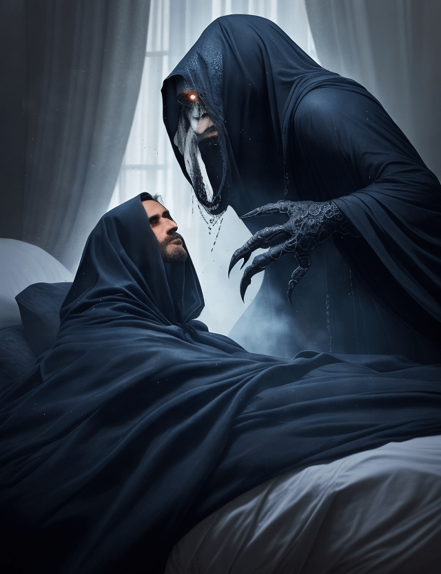 Summoning a brief surge of courage, Mark hesitantly unveiled his eyes, hoping to catch a glimpse of the mysterious presence that had sent chills down his spine. To his astonishment, he found himself locked in a chilling gaze with a sinister figure cloaked in darkness, emanating an undeniable aura of malevolence. Its piercing red eyes seemed to possess an unnerving awareness of Mark’s trembling encounter. In a disconcerting display, the figure extended its serpentine-like arms, adorned with dangling, obsidian-hued fingers, and advanced towards him with an unsettling, unnaturally precise motion. A profound sense of fear overwhelmed Mark, immobilizing him and leaving him bewildered. Doubt began to seep into his thoughts, questioning whether he had unwittingly slipped into a nightmarish realm. In an attempt to dispel this haunting notion, he desperately tried to pinch himself awake, only to discover the disheartening reality of his inability to escape this torment. The overwhelming terror left his mind in a turbulent state, engulfed by a chaotic whirlwind of confusion and uncertainty.