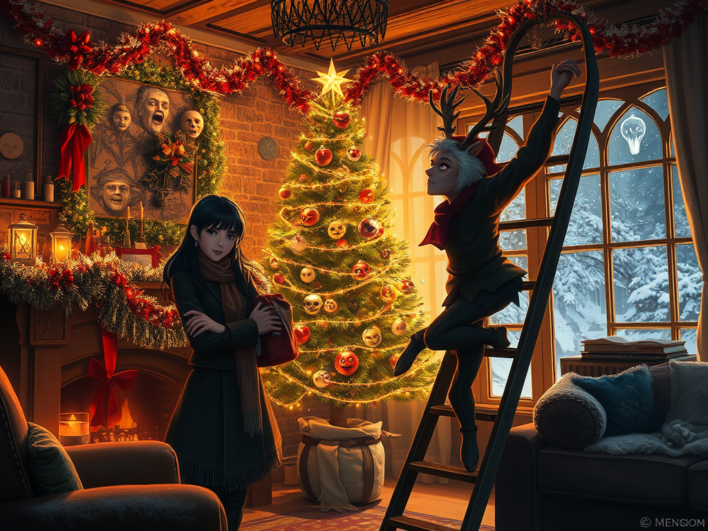 Emberlyn sighed, looking around the room. Tinsel dripped from every surface, ornaments dangled from the windows, and a small forest of miniature Christmas trees stood on every available table. Sol’s enthusiasm for the holiday was infectious—except when it threatened to turn their home into a cluttered maze of yuletide chaos.