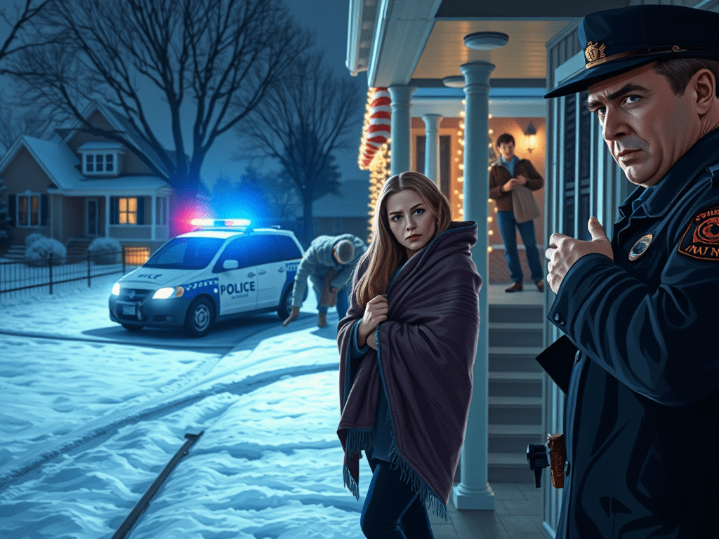 The flashing blue and red lights from the police cruiser lit up the front of the house, casting an eerie glow over the snow-covered lawn. Emberlyn and Sol stood on the porch, wrapped in blankets, still trying to shake the cold—and the fear—from their bones.